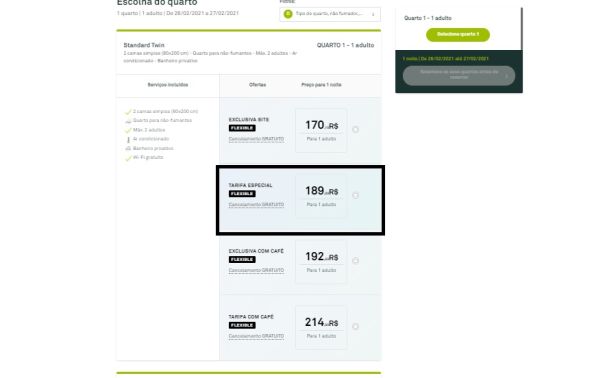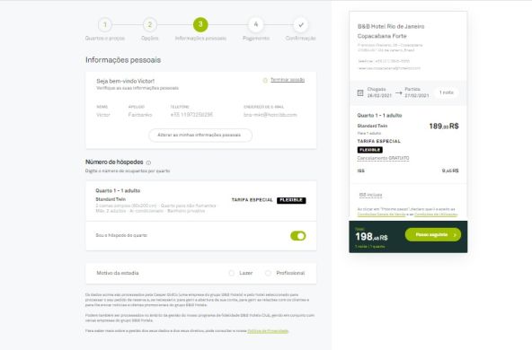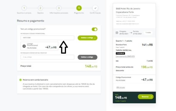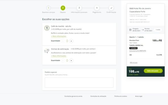 In this step, select if you want breaksfast or the pet option. After choosing it, go to the next step. Promocodes are only calculated on the offer value, not applied to extras, such as pet, extra breakfast, etc.