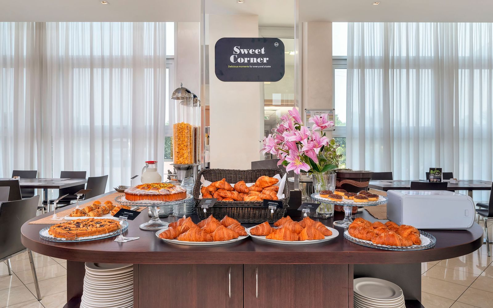 Um nicht auf das Vergnügen eines süßen Erwachens zu verzichten, kannst du jeden Morgen im Frühstücksraum ein reichhaltiges, abwechslungsreiches und leckeres Buffet mit hochwertigen Produkten genießen. Das Frühstück umfasst zahlreiche Optionen für Liebhaber von Süßem und Herzhaftem wie Croissants, Brot, Marmelade und Zwieback, Donuts, Kuchen, Muffins, Müsli, Joghurt, Rührei, Würstchen, Käse, Erfrischungsgetränke, Kaffee und vieles mehr... auch mit biologischen und glutenfreien Optionen!