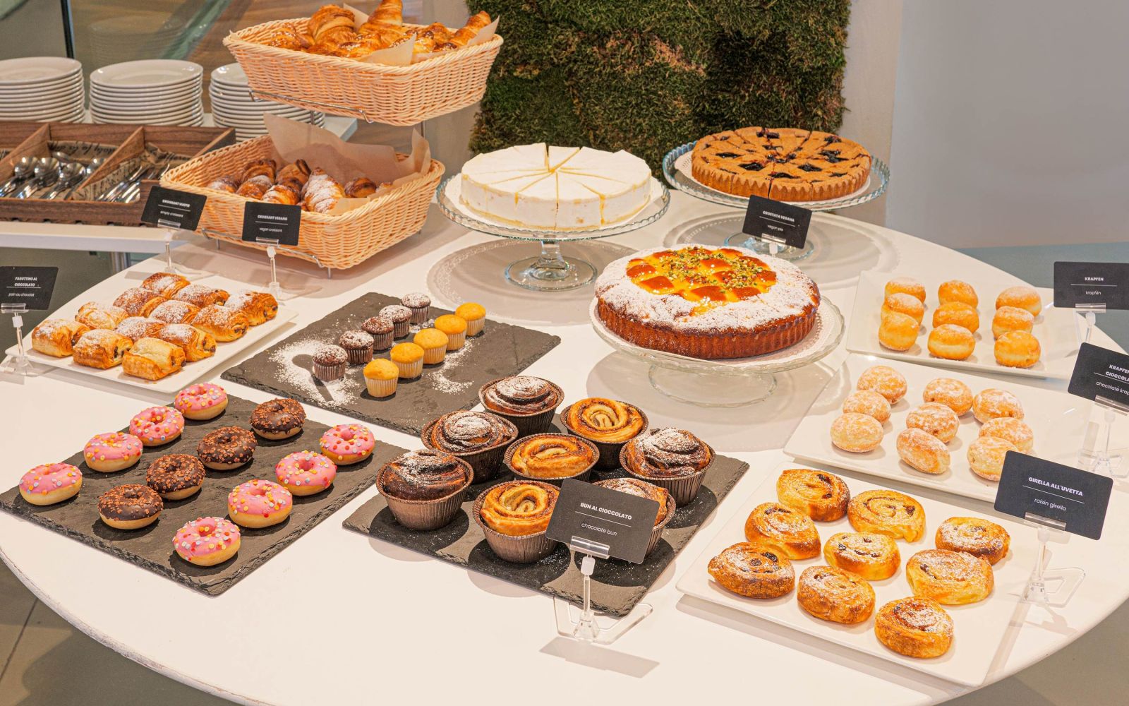 Um nicht auf das Vergnügen eines süßen Erwachens zu verzichten, kannst du jeden Morgen im Frühstücksraum ein reichhaltiges, abwechslungsreiches und leckeres Buffet mit hochwertigen Produkten genießen. Das Frühstück umfasst zahlreiche Optionen für Liebhaber von Süßem und Herzhaftem wie Croissants, Brot, Marmelade und Zwieback, Donuts, Kuchen, Muffins, Müsli, Joghurt, Rührei, Würstchen, Käse, Erfrischungsgetränke, Kaffee und vieles mehr... auch mit biologischen und glutenfreien Optionen!