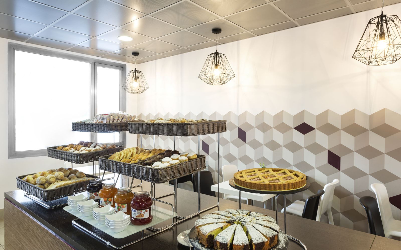Um nicht auf das Vergnügen eines süßen Erwachens zu verzichten, kannst du jeden Morgen im Frühstücksraum ein reichhaltiges, abwechslungsreiches und leckeres Buffet mit hochwertigen Produkten genießen. Das Frühstück umfasst zahlreiche Optionen für Liebhaber von Süßem und Herzhaftem wie Croissants, Brot, Marmelade und Zwieback, Donuts, Kuchen, Muffins, Müsli, Joghurt, Rührei, Würstchen, Käse, Erfrischungsgetränke, Kaffee und vieles mehr... auch mit biologischen und glutenfreien Optionen!