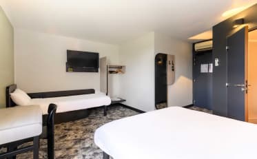 Sie genießen ein Zimmer, das die nötige Ausstattung für einen angenehmen Aufenthalt bietet: Bettaustattung von Bultex, Flachbildschirmfernseher mit Chromecast, mit dem Sie Ihre Lieblingssendungen auf Ihrem Computer oder Ihrem Tablet ansehen können.