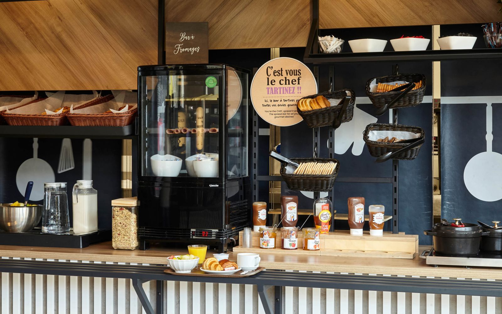 Enjoy an all-you-can-eat sweet and savoury breakfast buffet prepared with committed French suppliers. Savour pastries, pancakes and waffles, cereals, breads and rusks spread with delicious jams and Lucien Georgelin spreads, creamy Lune de miel honey or caramel, Charles & Alice compotes, Malo yoghurts... not to mention fresh fruit, orange and apple juice, eggs, cheese and preservative-free pork sausages! All accompanied by a hot drink of your choice: Baronny's tea, Coïc coffee, hot chocolate, almond milk or soya milk.