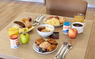 Para que no te vayas con hambre, aprovecha nuestro desayuno de bufé libre, que ofrece una amplia variedad de productos frescos dulces y salados: pan fresco, cruasanes, mantequilla, mermelada, biscotes, café ecológico, té y zumos de fruta.