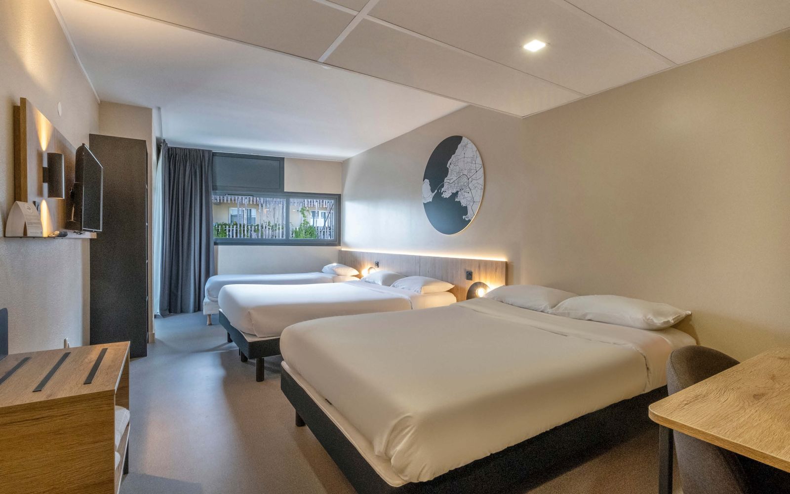 hôtel bien situé et facile d'accès, la chambre nécessiterait des travaux (fenêtre qui laisse passer l'eau de pluie), ventilation insuffisante (odeur de moisi), petit déjeuner et accueil satisfaisant, parking très bien
