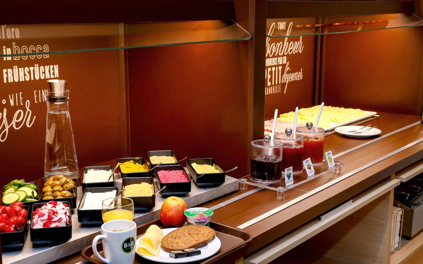 Nuestro desayuno buffet le ofrece una gran variedad de panes y panecillos, zumos, tés y cafés, cereales, muesli y yogures, carnes y quesos en lonchas, mermeladas, huevos cocidos, etc.