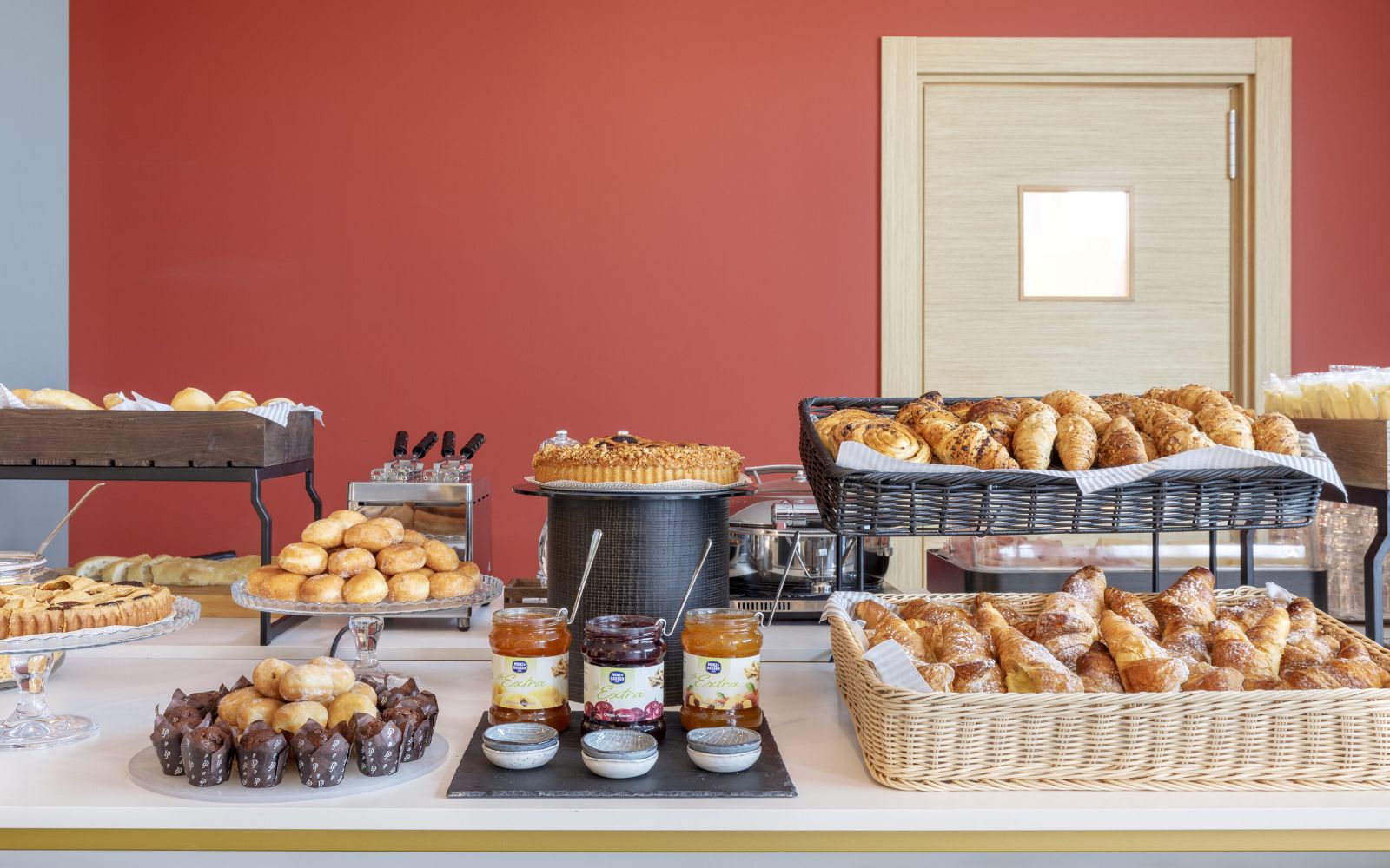 Para no renunciar al placer de un dulce despertar, todas las mañanas en la sala de desayunos se puede disfrutar de un rico, variado y delicioso buffet con productos de alta calidad. El desayuno incluye numerosas opciones para los amantes de lo dulce y lo salado, como croissants, pan, mermeladas y bizcochos, donuts, pasteles, magdalenas, cereales, yogur, huevos revueltos, salchichas, queso, refrescos, café y mucho más... ¡también con opciones ecológicas y sin gluten!