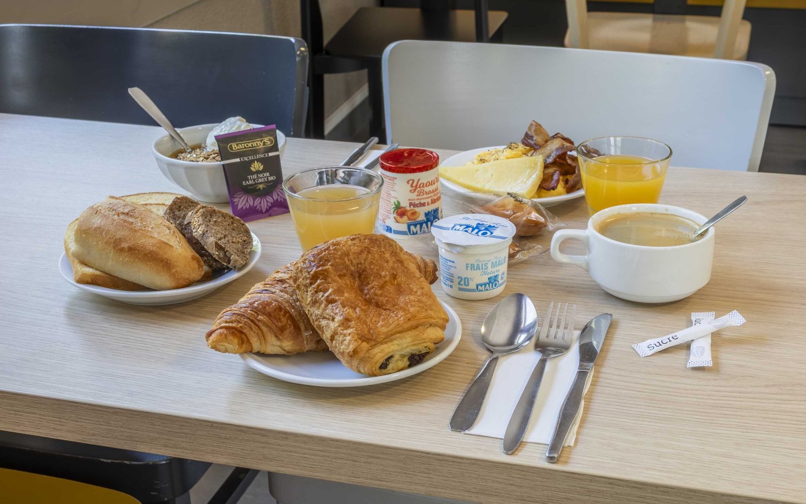 Profitez d’un petit-déjeuner buffet sucré-salé à volonté élaboré avec des fournisseurs français engagés. Dégustez des croissants et pains au chocolat, céréales, différents pains et biscottes à tartiner, de délicieuses confitures et de pâte à tartiner Lucien Georgelin , de miel Lune de miel ou de caramel, compotes Charles & Alice , yaourts Malo …sans oublier des fruits frais, un jus orange et pomme douceur, des œufs et du fromage, du bacon sans conservateurs ! Le tout accompagné d’une boisson chaude au choix: thé Baronny's, café Coïc et chocolat.