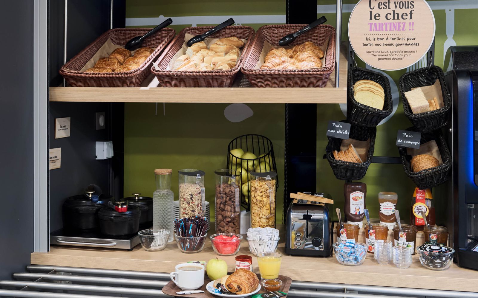 Gustate una colazione a buffet dolce e salata a volontà, preparata da fornitori francesi impegnati. Croissant e pains au chocolat, cereali, vari tipi di pane e fette biscottate da spalmare, deliziose marmellate e creme spalmabili di Lucien Georgelin, miele di Lune de miel o caramello, composte di Charles & Alice, yogurt di Malo... senza dimenticare la frutta fresca, il succo di frutta, le uova e il formaggio, il bacon senza conservanti! Il tutto accompagnato da una bevanda calda a scelta: tè Baronny, caffè Coïc e cioccolata.