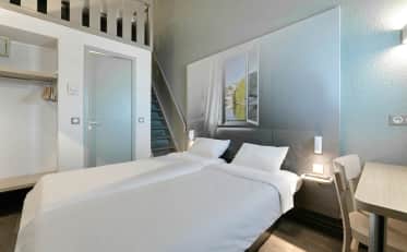 O nosso Hotel B&B Le Mans Nord 1 próximo do centro de Mans é ideal para os viajantes que desejem aproveitar a estadia para partir à descoberta da cidade. O nosso Hotel B&B situa-se nas proximidades da ZAC onde poderá encontrar muitos restaurantes e tem também um acesso fácil a partir dos principais eixos rodoviários A11, A81 e A28. Este estabelecimento encontra-se também a menos de 20 minutos da estação de Mans. Tem vontade de sair com a família? O Zoo de la Flèche não fica longe e vai seduzir toda a família. O centro da cidade de Mans, a menos de 7 quilómetros do nosso hotel, reserva-lhe também muitas surpresas, entre as quais visitas culturais, museus de arte e o charme do passado.